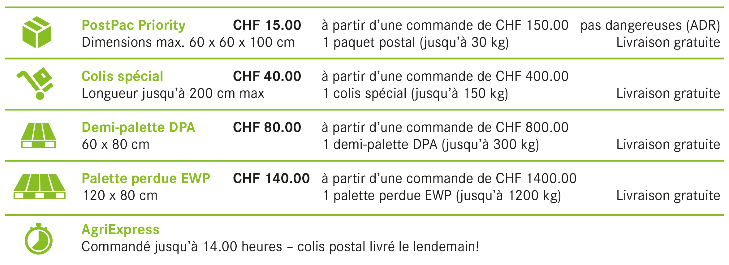 Nous nous déplaçons également dans ta région toutes les 2 à 4 semaines. Si tu le souhaites, nous pouvons te conseiller personnellement sur ton exploitation. Nous livrons gratuitement les livraisons de ferme plus importantes, qui sont économiquement et écologiquement acceptables.
