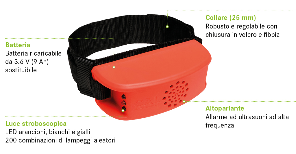 Il CAL collare anti-lupi è un sistema di difesa intelligente dotato di luce stroboscopica e allarme ad ultrasuoni ad alta frequenza. CAL protegge pecore, capre, bovini o cavalli dagli attacchi dei lupi. I programmi di lampeggiamento aleatorio e l’allarme a ultrasuoni ad alta frequenza molto fluttuante e aggressivo impediscono al lupo di abituarsi al collare.